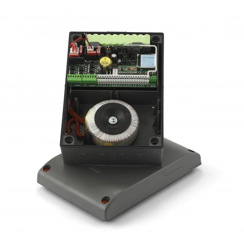 CC242ETOPCB CARDIN Centrale de commande pour le contrôle des moteurs de portail coulissant ou battant en 24V avec encodeur. Elle comprend un décodeur radio pour fréquence en 433 MHz et un programmateur digital avec un écran LCD pour le côté pratique et simple d’utilisation. Par ailleurs, dans ce modèle sont intégrés une batterie NiMH et son chargeur pour assurer le fonctionnement de l’ensemble de l’instaltion en cas de coupure électrique.